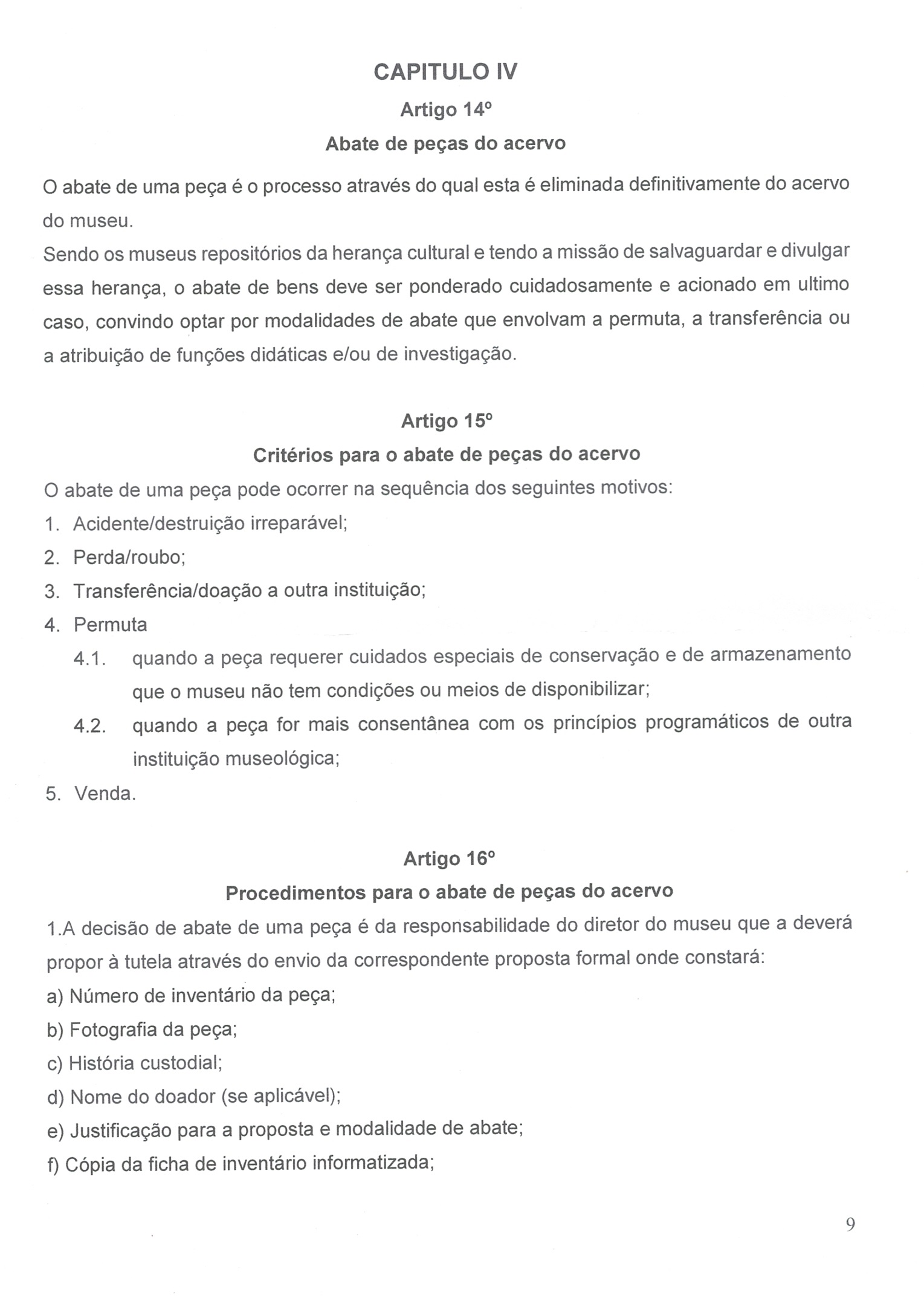 Sendo um imperativo legal o estabelecimento de regras e procedimentos normalizados e publicamente conhecidos reguladores da entrada e eventual abate de bens nos museus, o presente documento tem o propósito de: