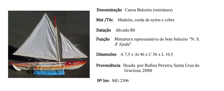 Bote, em miniatura, de formato losangular arrendondado, em madeira de costado baixo e liso e quilha ligeiramente aguçada. No interior possui 6 bancos, sendo que no segundo banco se coloca a meio num orifício o mastro. Mastro em madeira, equipado com 2 cabos "brandais" que se prendem nas duas extremidades para colocar as velas. Velas de pano branco de formato trinagular. Possui 6 remos com pá, esta numerada com faixa vermelha; remo de maior dimensão, com pá numa das extremidades, denominado remo de esparrela. A parte exterior do bote pintada a branco com uma faixa amarelada ladeada por filetes pretos junto à borda, possuindo matricula do barco e nome a preto e o interior pintado a azul no fundo, e vermelho nas laterais.