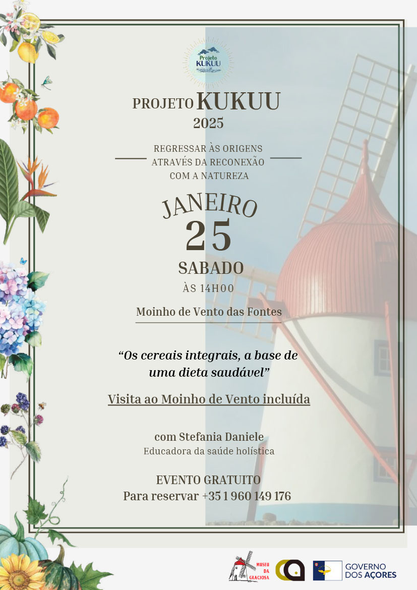 A sessão será realizada no Moinho das Fontes, polo visitável do Museu da Graciosa, estando prevista uma visita orientada ao espaço. Será abordada a temática da moagem na ilha Graciosa e simultaneamente os benefícios do consumo regular de cereais integrais, base da alimentação dos graciosenses no passado.