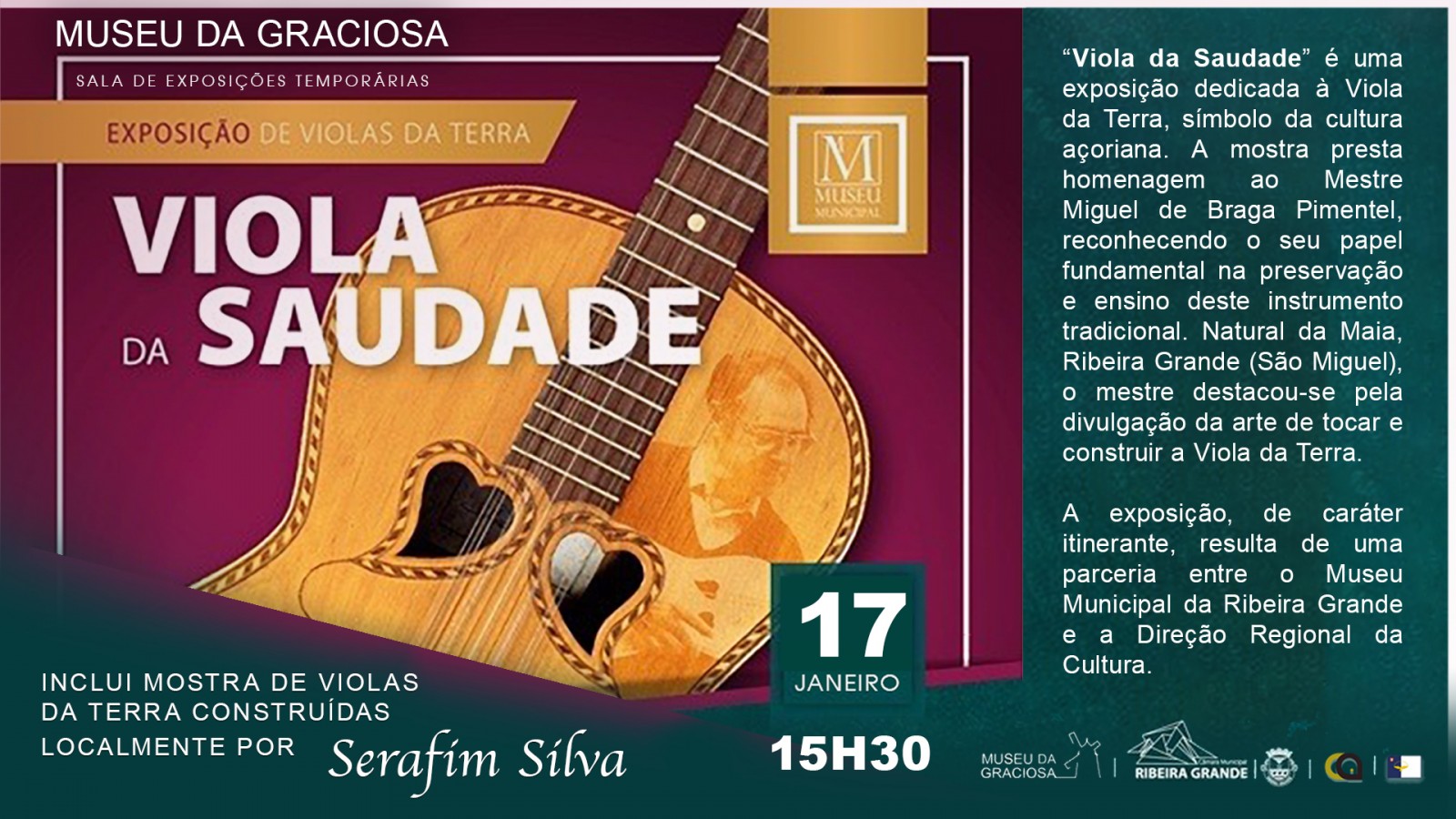O Museu da Graciosa convida:Inauguração da Exposição VIOLA DA SAUDADE, exposição itinerante resultado da parceria entre a Câmara Municipal da Ribeira Grande e a Direção Regional da Cultura.Contém dados históricos e sociais sobre a(s) Viola(s) da Terra dos Açores e uma mostra de instrumentos (sui generis) produzidos na Graciosa por Sera