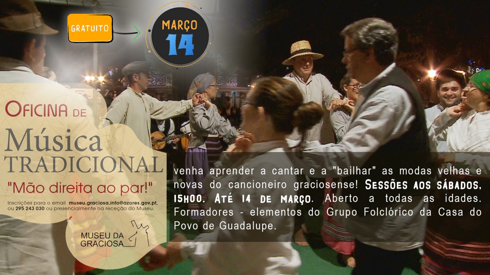 Com a colaboração do Grupo Folclórico da Casa do Povo de Guadalupe na qualidade de formador, o Museu da Graciosa promove uma oficina de Música Tradicional aberta a todos os interessados de todas as idades.As sessões realizam-se aos sábados pelas 15h, com inicio a 24 de janeiro.Inscrição através do email, telefone ou página do Facebook do Museu (men